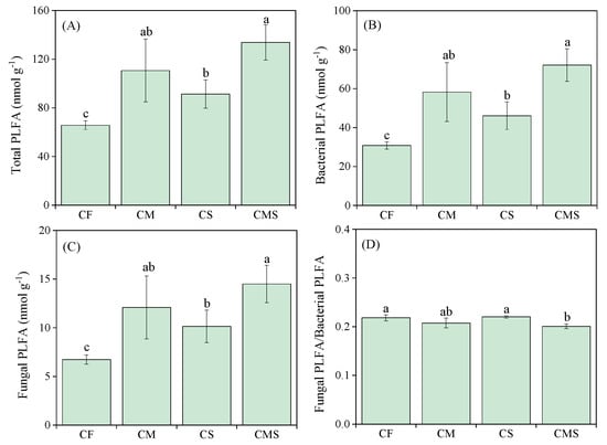 Effects of different fertilization treatments on total phospholipid fatty acid (PLFA) (A), bacterial PLFA (B), fungal PLFA (C), and fungal PLFA-to-bacterial PLFA ratio (D). Different lowercase letters indicate significant differences between treatments (p < 0.05). The error line shows the standard deviation of the three repeated measurements. CF, CM, CS, and CMS indicate chemical fertilizer, manure combined with chemical fertilizer, straw returning combined with chemical fertilizer, and straw returning combined with manure and chemical fertilizer.