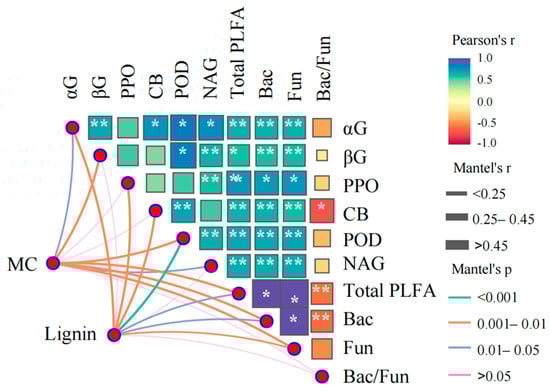 Results of correlation analysis and the Mantel analysis of microbial necromass, lignin phenols, enzymatic activity, and microbial PLFAs (n = 12). MC: bacterial, fungal, and total microbial necromass carbon; Lignin: vanillyl phenol, syringyl phenol, cinnamyl phenol, lignin phenol, syringyl-to-vanillyl phenol ratio, cinnamyl-to-vanillyl phenol ratio; αG: α-glucosidase; βG: β-glucosidase; PPO: polyphenol oxidase; CB: cellobiohydrolase; POD: peroxidase; NAG: N-acetyl-β-D-glucosidase; Bac: bacterial PLFAs; Fun: fungal PLFAs; Bac/Fun: bacterial-to-fungal PLFAs ratio. * and ** indicate statistically significance at p < 0.05 and p < 0.01.