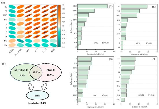 Effects of microbial necromass and lignin phenols on soil organic carbon fractions and stability (n = 12). (A) Correlation heatmaps showing the relationship of soil microbial necromass and lignin phenols with soil organic carbon fractions and stability. (B) Variation partitioning analysis was used to assess the effects of soil microbial necromass and lignin phenols on soil organic carbon fraction. (C–F) The random forest model elucidated the relative significance of soil microbial necromass and lignin phenols to soil organic carbon fraction and stability. * p < 0.05, ** p < 0.01. BNC: bacteria necromass carbon; FNC: fungal necromass carbon; TMC: total microbial necromass carbon; V: vanillyl phenol; S: syringyl phenol; C: cinnamyl phenol; LP: lignin phenol; S/V: syringyl-to-vanillyl phenol ratio; C/V: cinnamyl-to-vanillyl phenol ratio. DOC: dissolved organic carbon; POC: particulate organic carbon; MOC: mineral-associated organic carbon; SCMR: soil carbon mineral rate; Microbial-C: including bacterial necromass carbon, fungal necromass carbon, microbial necromass carbon, and fungal-to-bacterial necromass carbon ratio; Plant-C: including vanillyl phenol, syringyl phenol, cinnamyl phenol, lignin phenol, syringyl-to-vanillyl, and cinnamyl-to-vanillyl phenol ratios. SOM: including soil organic carbon, dissolved organic carbon, particulate organic carbon, mineral-associated organic carbon.