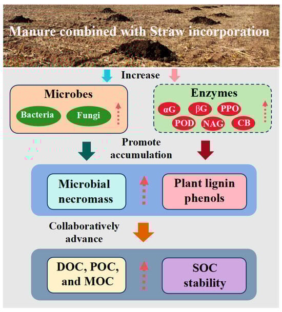 Conceptual diagram of the accumulation and contribution of microbial necromass carbon and lignin phenols to SOC fraction and stability under manure combined with straw incorporation. αG: α-glucosidase; βG: β-glucosidase; PPO: polyphenol oxidase; CB: cellobiohydrolase; POD: peroxidase; NAG: N-acetyl-β-D-glucosidase; SOC: soil organic carbon; DOC: dissolved organic carbon; POC: particulate organic carbon; MOC: mineral-associated organic carbon. The upward arrow along the dotted line indicates an upward trend.