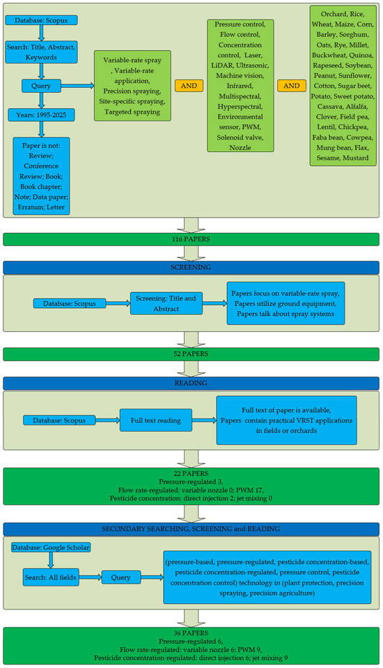 The Scopus database was selected for the literature search due to its comprehensive coverage of the scientific literature. A detailed search strategy was developed using a combination of keywords related to “variable-rate spray”, “variable-rate application”, “precision spraying”, and so on, for a total of 51 keywords (as shown in Figure 1). These terms were strategically combined using Boolean operators (AND/OR) and applied to the Title, Abstract, and Keyword fields within Scopus. The search was filtered to include only journal articles published between 1995 and 2025, excluding review articles, books/book chapters, letters, errata, data papers, and short surveys/notes. This initial search yielded 116 records.