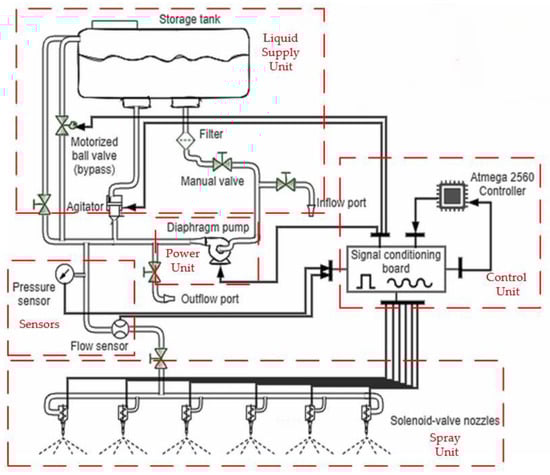 Pressure-regulated VRST utilizes the nonlinear relationship between pressure difference and flow rate in fluid mechanics to achieve precise control of the application flow rate by dynamically adjusting the line pressure. This technology has become the preferred solution for upgrading the variable application function of small and medium-sized plant protection machinery due to the advantages of its simple structure and low retrofit cost, and some representative studies are summarized in Table 1. Regardless of the VRST technology, the VRST system generally contains a liquid supply unit (tank, filter, agitator, valve group, pipeline, etc.), a power unit (centrifugal pump, diaphragm pump, etc.), sensors (flowmeter, pressure sensor, GPS positioning device, etc.), a control unit (PLC, microcontroller, embedded controller, etc., with control algorithms including PID, fuzzy logic, neural network, etc.), and a spray unit (spray bar, nozzle, etc.), as shown in Figure 2. The pressure regulator of a pressure-regulated variable-rate spray system mainly includes a proportional relief valve/pressure-reducing valve, ball valve, butterfly valve, etc. The technology still faces the following challenges in practical application: (1) The pressure difference in the system is proportional to the square of the flow rate, making it difficult to cover a wide range of flow rate adjustments. (2) Changes in pressure directly affect the distribution of droplet size. Droplet size is critical in plant protection, as it directly determines the target deposition efficiency, environmental safety, and pest control efficacy. When droplet size is too large, its coverage density is insufficient, penetration is poor, and the pesticide droplet is prone to rolling off the leaf surface. Conversely, when droplet size is too small, its depositing speed is slow, and the horizontal drift distance increases exponentially under the influence of wind. Additionally, high temperatures and low humidity accelerate droplet evaporation, further reducing droplet size and expanding the pollution range, posing a threat to adjacent crops and ecological safety. (3) The response speeds of traditional pressure regulators are slow, making it difficult to meet the real-time regulation requirements of high-speed operating machinery. In order to break through the above bottlenecks, future research needs to focus on the following: (1) at the hardware level, developing the pressure adaptive compensation function of the composite structure of the nozzle, with the optimization of the internal flow channel and other ways to reduce the sensitivity of the pressure change on the spray angle and droplet size; (2) at the level of the control strategy, integrating machine vision and other sources of sensor data to build a feedforward–feedback composite control model to achieve the dynamic matching of the travel speed, attitude changes, and pressure settings.