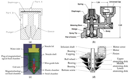Schematic structure of variable nozzles: (a) split-end meter plunger variable nozzle [27,28]; (b) varitarget nozzle [29]; (c) magnetorheological fluid nozzle [31]; (d) multi-layer centrifugal nozzle [32].