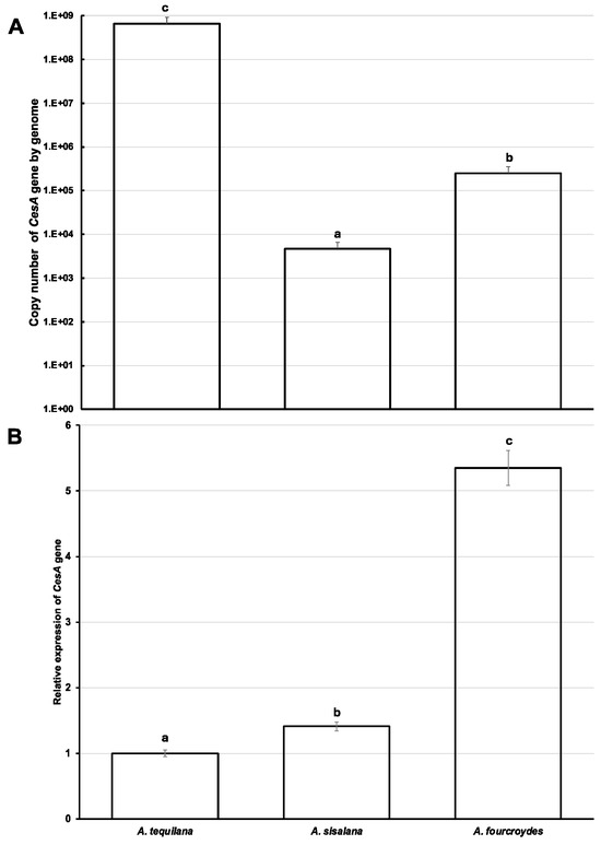 Number of copies of the CesA gene (A) and relative expression analysis of the CesA gene (B) evaluated in different species of Agave, A. tequilana, A. sisalana and A. fourcroydes. The bars represent the SDs. Different letters represent significant differences according to Student’s t test; p ≤ 0.05.