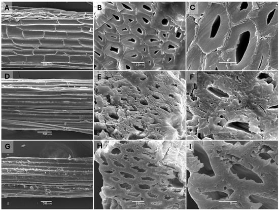 Longitudinal analysis of cellulose fibrils (A,D,G) at 50 µm and transverse (B,E,H) at 10 µm and (C,F,I) at 5 µm in different species of Agave, A. tequilana (G–I), A. sisalana (A–C) and A. fourcroydes (D–F).