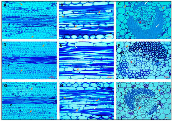 Structure and organization of the cellular components of the fibers, longitudinal sections at 100 μm (A,D,G), and 20 μm (B,E,H) and transverse sections at 20 μm (C,F,I), in different species of Agave, A. tequilana (G,H,I), A. sisalana (A,B,C) and A. fourcroydes (D,E,F). The black arrows correspond to vascular bundles, the yellow arrows correspond to spiral tracheids, the orange arrows correspond to parenchyma cells, the white arrows correspond to sclerenchyma fibers, and the red arrows correspond to phloem.