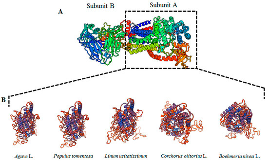 Modeling of the tertiary structure of the catalytic subunits A and B of cellulose synthase in different plant species. (A) Tertiary structure of the subunits, (B) tertiary structure in the different fiber-producing species.