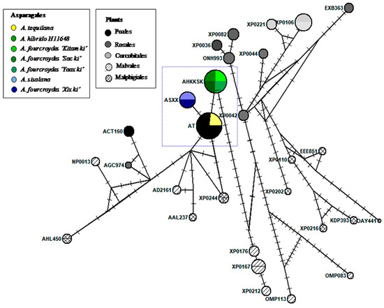 Haplotype network comparing Agave species with different families: Asparagales, Malphigiales, Poales, Malvales, Curcubitales and Rosales.