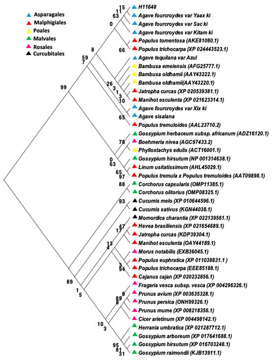 Recently, ref. [4] identified at least 38 CesA sequences from Agave H11648; in Agave sisalana and Agave, fourcroydes identified 14 CesA orthologs; and in Agave tequilana, 6 CesA orthologs were identified [15,16]. These studies were based on transcriptomes; however, more information on the cellulose synthase genes in Agave fiber-producing species still needs to be generated.