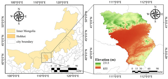 A Digital Elevation Model (DEM) is a digital representation of terrain elevation that provides explicit spatial information on topographic relief, slope gradient, and aspect. DEM data are typically stored in raster format with spatial resolutions ranging from 30 m to sub-meter precision, supporting multi-scale research and applications [22]. Hohhot City is situated on the Inner Mongolia Plateau, which is characterized by a terrain dominated by plains and low hills, with generally gentle slopes but localized undulations. The northern region transitions into the Daqing Mountains, while the southern area comprises the Tumochuan Plain, creating significant topographic contrasts. The spatial distribution and elevation characteristics of the DEM data are illustrated in Figure 1.