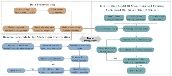 This study employed a three-phase approach: First, Sentinel-2 imagery was acquired on the Google Earth Engine (GEE) platform, followed by phenology-guided sampling to collect training data for silage maize, grain maize, and other land cover classes based on their distinct harvest timing. These samples were used to train the SMRF [23,24]. Second, time series NDVI and LSWI were computed alongside topographic features, smoothed using the Whittaker filter to enhance phenological signals, and analyzed to derive spectral index thresholds during key harvest stages. These thresholds, combined with topographic data, were integrated into the TempDiff-SMID [25,26,27]. Finally, both models (SMRF and TempDiff-SMID) were evaluated and compared using overall accuracy, Kappa coefficient, user’s/producer’s accuracies, and F1-scores [28], with the workflow illustrated in Figure 2.