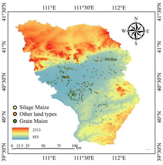 Training samples for silage maize, grain maize, and other land cover classes were collected through field surveys and visual interpretation. Collaborative efforts with Hohhot agro-meteorological stations provided georeferenced points and phenological records, which guided sample selection for silage and grain maize. Additional samples were identified by analyzing spectral differences in false-color composites and temporal Sentinel-2 imagery, ensuring the representative coverage of crop types and non-crop features.