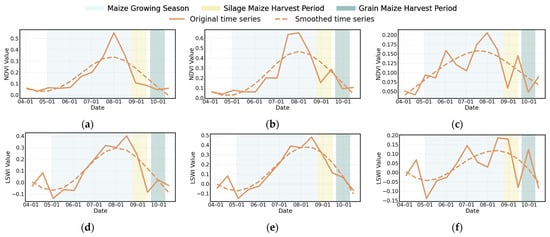 Time series curves of NDVI and its filtered NDVI_fitted and LSWI and its filtered LSWI_fitted. (a–c) are time series curves of NDVI and NDVI_fitted after Whittaker smoothing filtering, where (a) represents the NDVI of silage maize sample points, (b) represents the NDVI of ordinary corn sample points, and (c) represents the NDVI of other land sample points; (d–f) are time series curves of LSWI and LSWI_fitted after Whittaker smoothing filtering, where (d) represents the LSWI of silage maize sample points, (e) represents the LSWI of ordinary corn sample points, and (f) represents the LSWI of other land sample points. The solid line represents the original timing curve, and the dotted line represents the filtered timing curve.