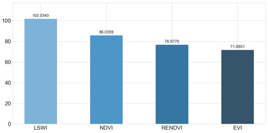 The experimental results (Figure 5) revealed that the LSWI exhibited the highest feature importance, significantly outperforming other vegetation indices. This dominance is closely linked to LSWI’s sensitivity to canopy moisture content in the SWIR band. The NDVI ranked second in importance, validating its classical role in capturing vegetation coverage and chlorophyll dynamics. The observed importance gradient (LSWI > NDVI > RENDVI > EVI) highlights the key biophysical drivers of maize cultivation systems in the study area and confirms the appropriateness of integrating LSWI and NDVI as decision thresholds in the TempDiff-SMID. These findings underscore the synergistic value of moisture-sensitive (LSWI) and biomass-sensitive (NDVI) indices for phenology-driven crop discrimination.