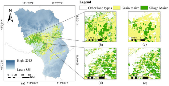 Comparison of mapping details of different classification methods: (a) is the classification result of the silage maize ordinary corn identification model based on harvest time differences in Hohhot in 2023, (b) is the classification result of the decision tree model in Tumote Zuoqi, (c) is the classification result of the SMRF in Tumote Zuoqi, (d) is the classification result of the decision tree model in Xinyingzi Town, and (e) is the classification result of the SMRF in Xinyingzi Town.