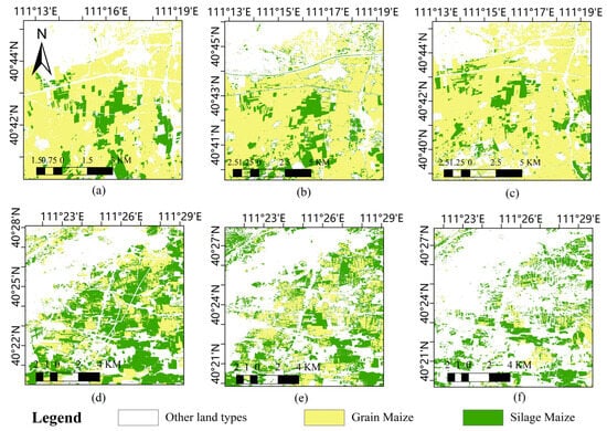 Classification results of TempDiff-SMID in multiple years: (a–c) are the decision tree classifications of silage maize and grain maize near Tumote Zuoqi in 2023, 2022, and 2021, respectively, and (d–f) are the decision tree classifications of silage maize and grain maize near Xinyingzi Town in 2023, 2022, and 2021, respectively.