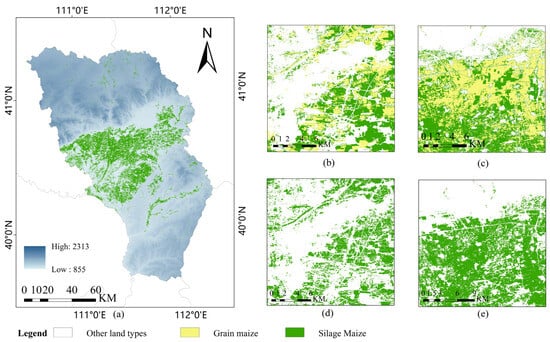 Comparison of classification details between TempDiff-SMID and existing maize classi-fication results. (a) classification result of the existing product in Hohhot City [34] ); (b) and (c) show the decision tree classification results of silage maize and grain maize near Tumed Left Banner and Xinyingzi Town, respectively; (d,e) present the corresponding classification results of existing maize products in the same areas [34].