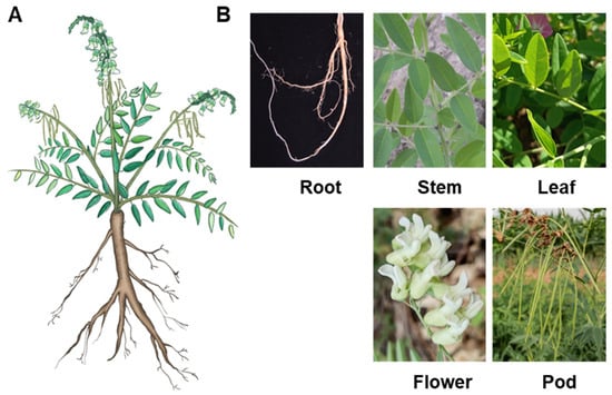 To study the content differences of flavonoids and alkaloids among five tissues (roots, stems, leaves, flowers, and young pods), we collected samples from five-year-old S. flavescens with consistent growth conditions (Figure 1). For each tissue, three biological replicates were collected. The S. flavescens plants grow naturally after sowing without any artificial intervention in the Changzhi International Shennong Traditional Chinese Medicine Culture Expo Park, located in Shangdang District, Changzhi City, Shanxi Province. After rinsing them with PBS buffer, the samples were immediately submerged in liquid nitrogen for rapid freezing and subsequently stored at −80 °C for further transcriptome and metabolome detection.