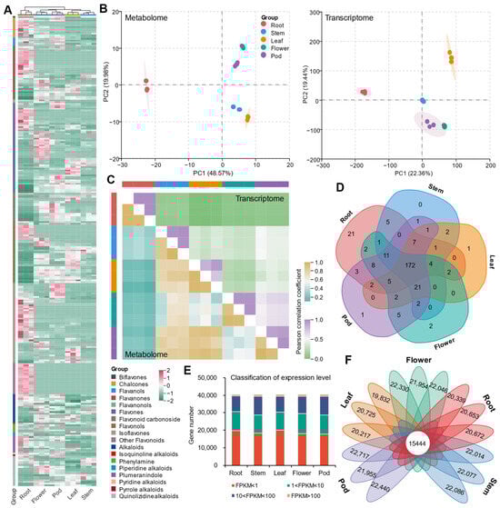Overview of transcriptome and metabolome. (A) Flavonoid and alkaloid accumulation in S. flavescens. (B) PCA of metabolome and transcriptome. (C) Correlation analysis between any two different samples. The upper right corner represents the transcriptome correlation between samples, and the lower left corner represents the metabolome correlation between samples. (D) The type comparison of metabolites with accumulated content detected among different tissues. (E) Comparative analysis of gene expression levels among the five tissues. (F) Flower Venn diagram of expressed genes (FPKM > 1) among the five tissues.