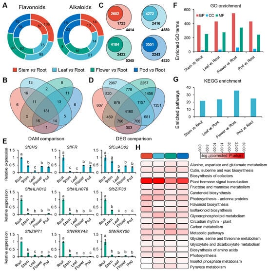 Analysis of DAMs and DEGs among the four comparisons. (A) DAF and DAA numbers in the four comparisons. (B) Comparison of DEG numbers among the four comparisons. (C) DEG numbers categorized by FC: white numbers in the inner circle, black numbers in the outer circle, and numbers outside the circle indicate DEGs with ≥8-FC, ≥4-, <8-FC, and <4-FC in roots compared with other tissues. (D) Comparison of DAM numbers among the four comparisons. (E) Expression profiles of 10 SM biosynthesis-related genes via RT-qPCR technology. The vertical bars followed the different letters (a, b or c) were significantly differences according to ANOVA with Duncan’s test (p < 0.05). (F) The counts of significantly enriched GO terms for DEGs across different comparison groups. (G) The counts of significantly enriched KEGG pathways for DEGs in different comparison groups. (H) The significantly enriched KEGG pathways among the four comparison groups.