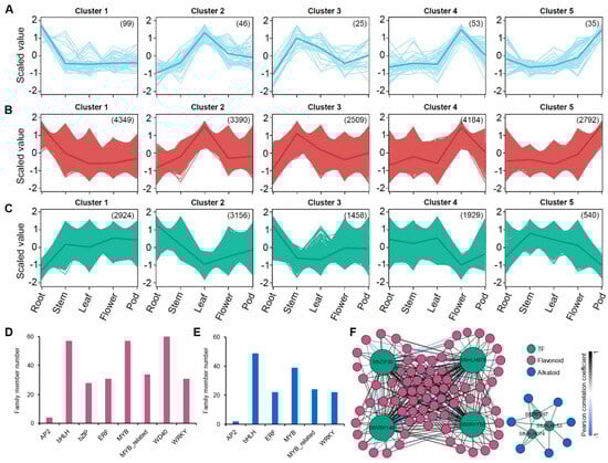 K-means clustering of DEGs significantly correlated with DAM content. (A–C) By utilizing the profiles of DAM accumulation and DEG expression, the correlation was calculated and generated a k-means plot. Blue indicates the metabolome k-means, red shows DEGs positively correlated with the metabolome, and green shows DEGs negatively correlated with the metabolome (|r| > 0.9, p < 0.05). (D) TFs significantly correlated with flavonoid metabolites and their classification. (E) TFs significantly correlated with alkaloid metabolites and their classification. (F) Network diagram of the 7 most significant TFs related to flavonoids and alkaloids.