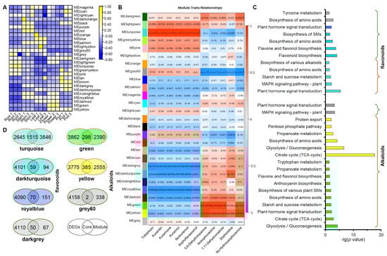 Gene co-expressed modules and their metabolite associations. (A) Heatmap of 27 modules showing expression trends across five tissues. (B) Association of some important flavonoids or alkaloids with modules. (C) Enriched KEGG pathways of genes in flavonoid- or alkaloid-correlated modules. (D) Comparison of genes in 7 significantly correlated modules in S. flavescens with DEGs across four comparisons (Stem vs. Root, Leaf vs. Root, Flower vs. Root and Pod vs. Root).