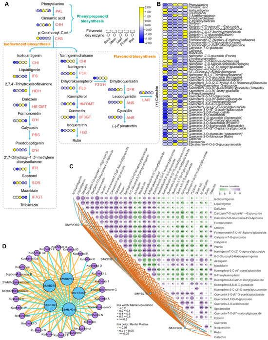 Regulation of flavonoid biosynthesis in S. flavescens. (A) Schematic of the flavonoid biosynthesis pathway in S. flavescens. (B) The relative content distribution of flavonoids related to the proposed metabolic pathway. (C) Correlation network diagram of flavonoids and their key regulatory TFs related to the proposed metabolic pathway. *, ** and *** indicate the significantly difference at p < 0.05, 0.01 and 0.001, respectively. (D) Network diagram of other important flavonoids and their key regulatory TFs in S. flavescens.