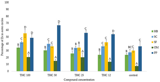 - Laznik, Ž.; Košir, I.J.; Košmelj, K.; Murovec, J.; Jagodič, A.; Trdan, S.; Kocjan Ačko, D.; Flajšman, M. Effect of Cannabis sativa L. root, leaf and inflorescence ethanol extracts on the chemotrophic response of entomopathogenic nematodes. Plant Soil 2020, 455, 367–379. [Google Scholar] [CrossRef]