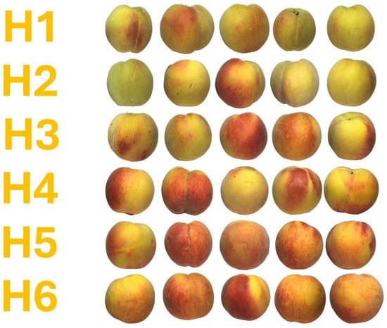 In this study, different firmness thresholds were used to present various maturity stages of peaches (summarised in Table 2). Firmness was selected since it is a key indicator of peach maturity prediction [2,10] and because it is responsible for the useful lifespan of the product, e.g., handling resistance and shelf-life longevity [13,19]. Shane [28], partly on the summaries developed by Carlos Crisosto, stated that the ideal peach firmness range for harvesting and packing for long-distance chain stores is from 7.26 to 5.44 kg·cm−2 and from 5.44 to 3.63 kg·cm−2 for medium ones. Hence, the firmness range for harvesting and packing for long-distance chain stores was used as the first maturity category. Peaches at harvest should have firmness no more than 4.59 kg·cm−2 in order to meet the quality standards, per Ramina et al. [6], according to Neri et al. [29]. Therefore, to address the growing dissatisfaction of consumers with the organoleptic properties of peaches harvested too early, a second maturity range was used up to the aforementioned firmness level. Furthermore, peaches can be labelled as “ready to buy” and “ready to eat”, which is a helpful tool for retailers to estimate the possible time for fruit commercialisation. Valero et al. [30] defined that “ready to buy” peaches have firmness from 1.84 to 3.57 kg·cm−2, while Crisosto et al. [31] defined that “ready to eat” peaches have firmness from 0.9 to 1.8 kg·cm−2. Hence, these two firmness ranges represent the following two categories. Peaches with firmness less than ready to eat category (<0.9 kg·cm−2) were classified as overripe. In the available literature, somewhat different peach maturity categorisations with narrower firmness ranges are also present [10,31,32,33]. However, the ranges used in this study were chosen to better integrate maturity categories, and were effective in previous studies as well [8,14,30]. Visual representation of randomly selected peaches for each maturity group is shown in Figure 1.