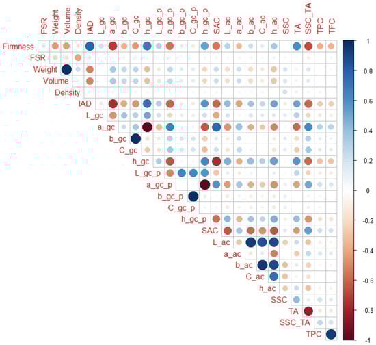 Correlation matrix for H4–H6 peach maturity categories. Legend: red or blue circles present significant positive or negative Pearson correlation coefficients (respectively), darker tone and bigger circle present higher correlation strength.