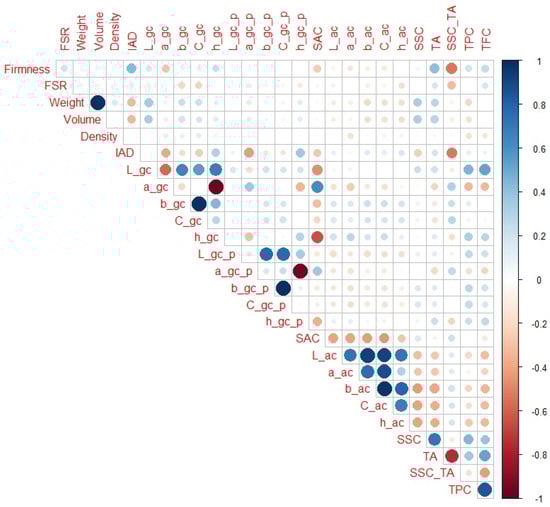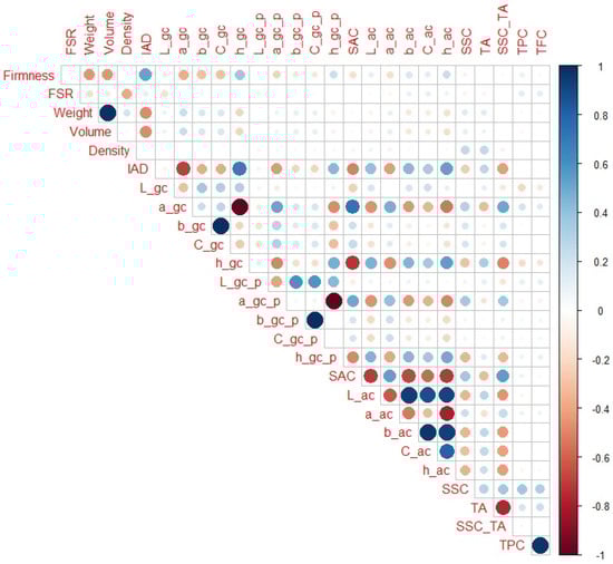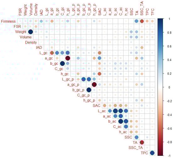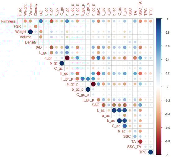 When only H5 and H6 maturity categories are observed (Figure 7), IAD (r = 0.43) had the highest correlation with firmness among the non-destructive parameters, and SSC_TA and TA (r = −0.54 and 0.0.42, respectively) had the highest correlation with firmness among the destructive parameters. In addition to obvious notable correlations (as weight with volume), L_gc, a_gc, and h_gc were notably correlated with SAC (r = −0.46, 0.62 and −0.64, respectively), which was not the case for IAD or firmness. In contrast to the previous maturity ranges, firmness and IAD had higher correlations with SSC_TA than a_gc and h_gc (r = 0.31 and −0.18, respectively). Additionally, firmness had a higher correlation with TA than IAD, a_gc, or h_gc (r = 0.19, −0.23, and 0.14, respectively). It should also be noted that L_gc showed notable correlation with TPC and TFC (r = 0.45 and 0.53, respectively), which was not the case in other maturity ranges. In addition, TA and SSC_TA had notable correlations with TFC (r = 0.53 and −0.43, respectively).