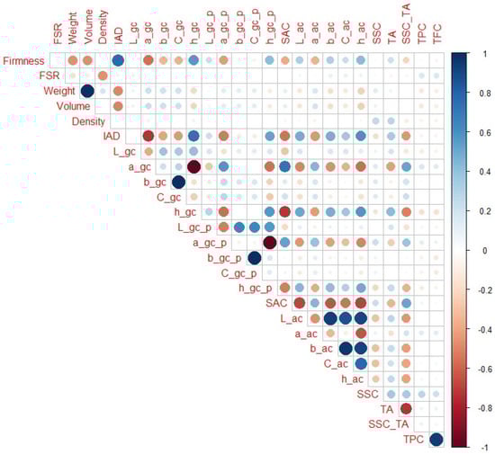 Correlation matrix for H1–H3 peach maturity categories. Legend: red or blue circles present significant positive or negative Pearson correlation coefficients (respectively), darker tone and bigger circle present higher correlation strength.