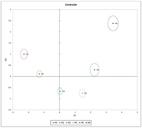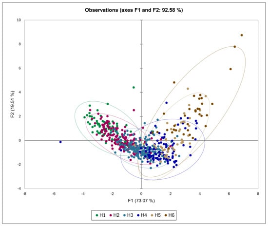 According to DA (Figure 8 and Figure 9), it is evident that the H1 and H2 peaches distinguish between H5 and H6 peaches according to the F1 axis, meaning that they mostly differ between each other with respect to IAD, a_gc, h_ac, and L_gc_p. The F2 axis showed no clear observation, only that H1 and H6 peaches partly differ from H3 and H4 peaches. Separation along the F1 axis is logical, as previous statistical analysis showed that IAD was the parameter that most clearly distinguished between various maturity groups.
