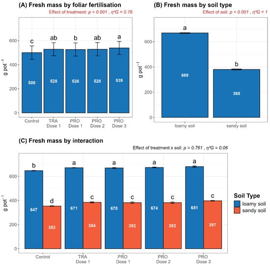 Maize fresh mass: (A) fresh mass by foliar fertilization, (B) fresh mass by soil type, and (C) fresh mass by interaction. Different lowercase letters denote statistically significant differences between means as determined by Tukey’s test (p < 0.05). Error bars represent the standard error of the mean (SEM).