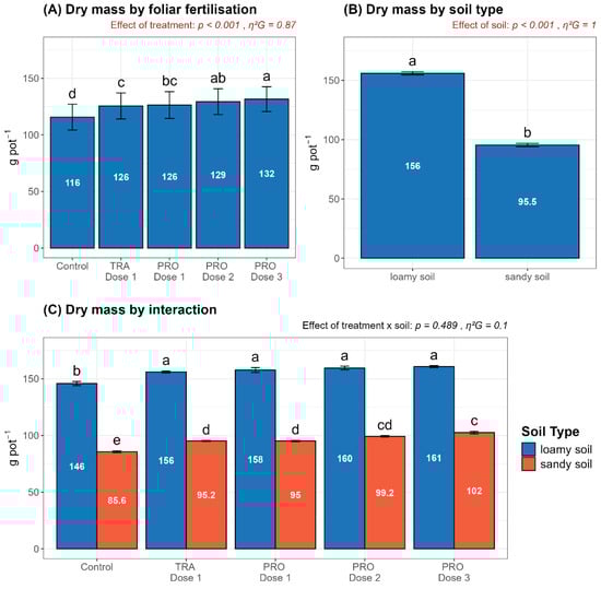 Maize dry mass: (A) dry mass by foliar fertilization, (B) dry mass by soil type, and (C) dry mass by interaction. Different lowercase letters denote statistically significant differences between means as determined by Tukey’s test (p < 0.05). Error bars represent the standard error of the mean (SEM).