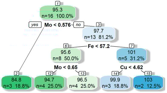 Molybdenum (Mo) emerged as the main separating variable (threshold: 0.576), followed by iron (Fe) and copper (Cu) with thresholds of 57.2 and 4.62, respectively. Numbers at the nodes indicate average dry matter yield (g), sample size (n), and percentage of all observations. While the tree structure prioritises Mo > Fe > Cu as threshold-dependent determinants, global variable importance analysis identified a hierarchy of B > Mn > Fe > Cu > Zn > Mo. This discrepancy between tree structure and the importance of variables indicates that, while molybdenum is the first separating factor in tree structure, global yield variability is most strongly related to boron and manganese content. The model parameters (RMSE = 2.48, R2 = 0.89) indicate high predictive accuracy, with a potential yield increase of 21% due to micronutrient optimization.