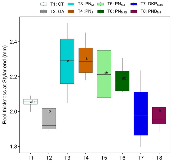 Table A2). This effect was especially evident at the stylar end of the fruit; however, no significant differences were noted in the equatorial section, suggesting that the impact of K on peel thickness may be location-specific within the fruit. In contrast, frequent foliar K applied either from PN, DKP, or additional B did not enhance the peel thickness of Sugar Belle