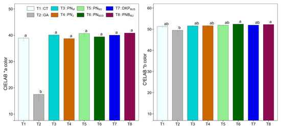 32]. Nevertheless, the significant reduction in green-to-red (a*) and blue-to-yellow (b*) gradient values observed with the GA treatment suggested that Gibberellic acid (GA) application may inhibit the color break process. The suppression of color break in citrus fruit by GA has been documented in other studies, where GA was shown to delay the color transition during fruit maturation, possibly due to its effects on ethylene biosynthesis [