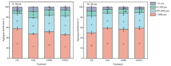 Soil aggregate distribution was significantly influenced by the treatments (Figure 1). Compared to CK, the GM treatment reduced the mass proportion of aggregates >2000 µm in the 0–10 cm soil layer while increasing the proportion of 53–250 µm aggregates. However, the situation was reversed in the 10–20 cm soil layer. The addition of biochar (GMB) or combined amendments (GMVC) further increased the proportion of macro-aggregates (>2000 µm) in the 0–10 cm soil layer while reducing the fraction of micro-aggregates (<53 µm) compared to GM alone.