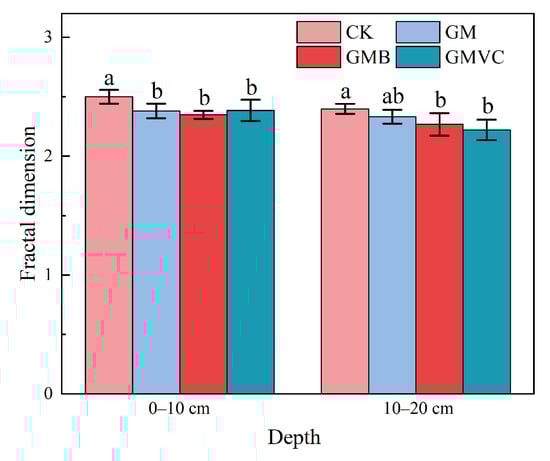 Soil fractal dimension was significantly influenced by the treatments (Figure 2). Compared to CK, the GM treatment significantly reduced the fractal dimension (D) in the 0–10 cm soil layer. In the 10–20 cm soil layer, the GMB and GMVC treatments significantly decreased the D compared to CK.