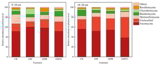 Compared to CK, the GM treatment significantly increased the abundance of Ascomycota and Chytridiomycota in the 0–10 cm soil layer, and significantly decreased the abundance of Mortierellomycota, Basidiomycota, and Rozellomycota in the 0–10 cm soil layer and the abundance of Basidiomycota in the 10–20 cm soil layer. Compared to the GM treatment, the GMB treatment significantly decreased the abundance of Chytridiomycota in the 0–10 cm soil layer, and significantly increased the abundance of Rozellomycota in the 0–20 cm soil layer. Compared to the GM treatment, the GMVC treatment significantly decreased the abundance of Ascomycota and Chytridiomycota in the 0–10 cm soil layer and the abundance of Ascomycota and Basidiomycota in the 10–20 cm soil layer, and significantly increased the abundance of Mortierellomycota and Basidiomycota in the 0–10 cm soil layer and the abundance of Mortierellomycota and Rozellomycota in the 10–20 cm soil layer (Figure 3).