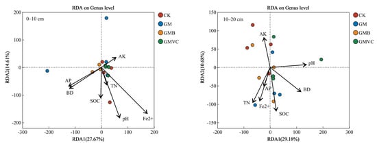 RDA analysis was conducted on the fungal community composition in the 0–20 cm soil layer under different treatments (Figure 4). The Monte Carlo permutation test indicated that soil organic carbon (SOC), bulk density (BD), pH, and Fe2+ were the main environmental factors causing changes in the fungal community structure in each treatment within the 0–10 cm soil layer, while pH and SOC were the main environmental factors causing changes in the fungal community structure in each treatment within the 10–20 cm soil layer.