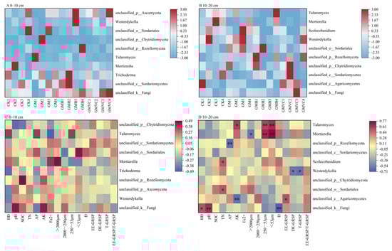 The results of Pearson correlation showed that there was a significant positive correlation between Talaromyces and AK, 53–250 μm aggregate mass ratio and <53 μm aggregate mass ratio in the 10–20 cm soil layer. Mortierella was significantly positively correlated with the mass ratio of 53–250 μm aggregates, <53 μm aggregates, and >2000 μm aggregates. unclassified_c__Rozellomycota showed a very significant negative correlation; Scolecobasidium was significantly positively correlated with TN. Westerdykella was negatively correlated with DE-GRSP and T-GRSP. unclassified_o__Sordariales was significantly positively correlated with TN. unclassified_c__Agaricomycetes was significantly positively correlated with EE-GRSP and negatively correlated with AK. unclassified_k__Fungi was significantly positively correlated with BD and pH, and negatively correlated with D (Figure 5C,D).