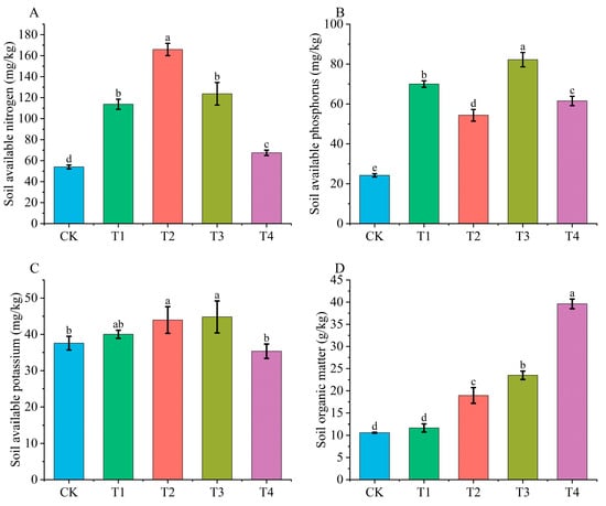 Chemical composition of the soil during the peak flowering period. (A): Soil-available nitrogen; (B): soil-available phosphorus; (C): soil-available potassium; (D): soil organic matter. Different letters in the same column indicate significant differences at 5% level.