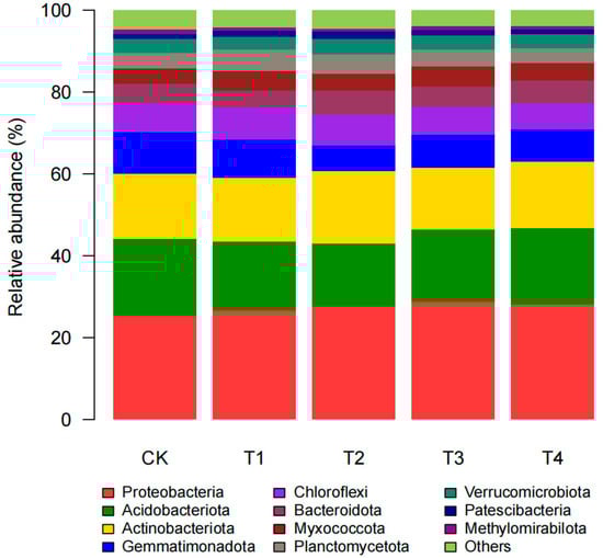 The Chao1 and ACE indices of bacteria in T2 and T3 increased by 1.41–1.87% and 1.09–2.89%, respectively, compared to the control, indicating that T2 and T3 improved soil bacterial abundance. Conversely, the Chao1 and ACE indices of bacteria in T1 and T4 were significantly lower than the control, reducing soil bacterial abundance. The application of traditional Chinese medicine fertilizer increased the Shannon and Simpson indices, although the differences from the control were not significant, suggesting enhanced soil bacterial diversity (Table S1). In the first principal coordinate component, the distance between CK and each treatment with Chinese medicine fertilizer was significant. In the third principal coordinate component, the distances between T1, T2 and T3 were significant, while the distance between T4 and T3 was not significant. This indicates that applying Chinese medicine fertilizer significantly altered soil bacterial richness and community composition, with different ratios significantly affecting these parameters (Figure S1).