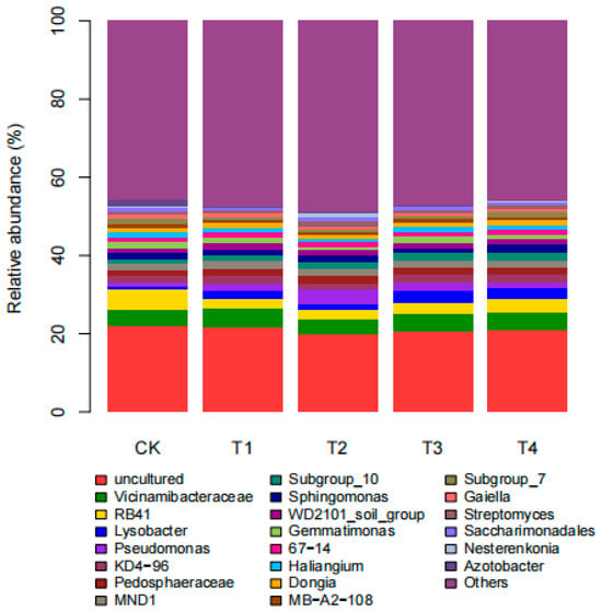 A total of 50 bacterial phyla were detected. The bacterial phyla with a relative abundance of more than 1% include Proteobacteria, Acidobacteriota, Actinobacteriota, Gemmatimonadota, Chloroflexi, Bacteroidota, Myxococcota, Planctomycetota, Verrucomicrobiota, Patescibacteria and Methylomirabilota. Proteobacteria, Acidobacteria and Actinobacteria are the three dominant phyla. The effects of Chinese herbal compound fertilizer on soil microbial groups varied with the formulation. Chinese herbal compound fertilizer application increased the relative abundance of Proteobacteria, and the relative abundance of T3 was the highest, followed by T4. The relative abundance of Acidobacteria was the lowest in T2 and the highest in T4. The relative abundance of Actinobacteria in T2 was the highest, followed by T4, which increased by 10.69% and 0.69%, respectively, compared with CK. In addition, the relative abundance of Gemmatimonadetes in CK was 10.12%, which was higher than that of all treatments applying Chinese herbal compound fertilizer (Figure 2).