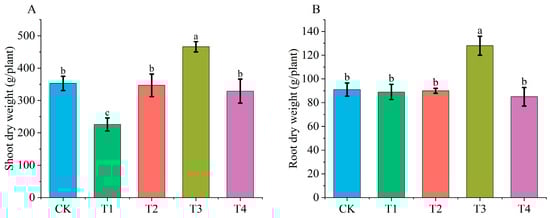 The aboveground (shoot) dry weight from the T3 treatment was significantly higher than that of other treatments, and the T1 treatment had the lowest aboveground dry weight (Figure 4A). The underground (root) dry weight in the T3 treatment was significantly higher than that in the other treatments, with no significant difference between the other treatments (Figure 4B).
