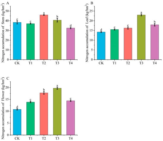 Nitrogen accumulation in each part of the plant after harvest. (A): Stem nitrogen accumulation; (B): leaf nitrogen accumulation; (C): nitrogen accumulation of flowers. Different letters in the same column indicate significant differences at 5% level.