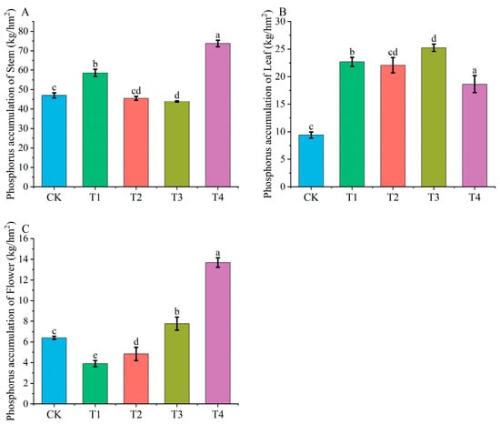 Phosphorus accumulation in each part of the plant after harvest. (A): Phosphorus accumulation in stems; (B): leaf phosphorus accumulation; (C): phosphorus accumulation in flowers. Different letters in the same column indicate significant differences at 5% level.