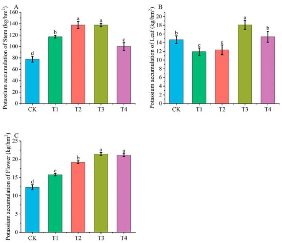 Potassium accumulation in each part of the plant after harvest. (A): Potassium accumulation in stems; (B): potassium accumulation in leaves; (C): potassium accumulation of flowers. Different letters in the same column indicate significant differences at 5% level.
